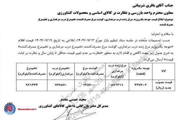 رئیس اتحادیه صنف مرغ و تخممرغ مرکز مازندران، خاطرنشان کرد: قیمت کنونی مرغ در بازار، ۱۳۵ هزار و ۷۰۰ هزار تومان است که این رقم نیز، با توجه به افزایش هزینههای تولید و نیز علوفه و دام، در نهایت برای تولیدکننده، مقرون به صرفه نیست و باید سیاستهای کلان کشور بهگونهای باشد که با قیمتگذاری صحیح نهادهها و هزینهها، میبایست تولید را جذاب و مقرون به صرفه کرد؛ چرا که مرغداران در صف نخست سنگر تولید قرار دارند.