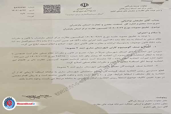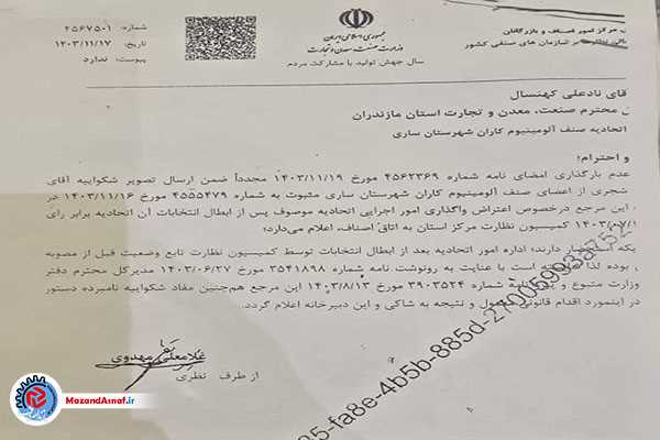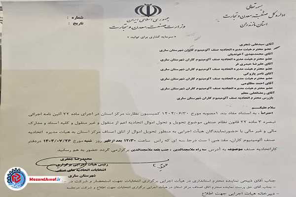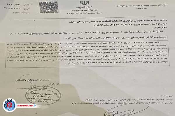 شایان ذکر است در ادامه بر اساس نامه شماره ۵۸۴۶۶۹۴ مورخ ۲۶ مردادماه ۱۴۰۴ دبیرخانه هیئت عالی نظارت و مصوبه مورخ ۳۰ شهریورماه ۱۴۰۴ کمیسیون نظارت مرکز استان مازندران، امورات اتحادیه صنف آلومینیومکاران ساری تا زمان برگزاری انتخابات جدید، مجددا به هیئت مدیره سابق واگذار شد.